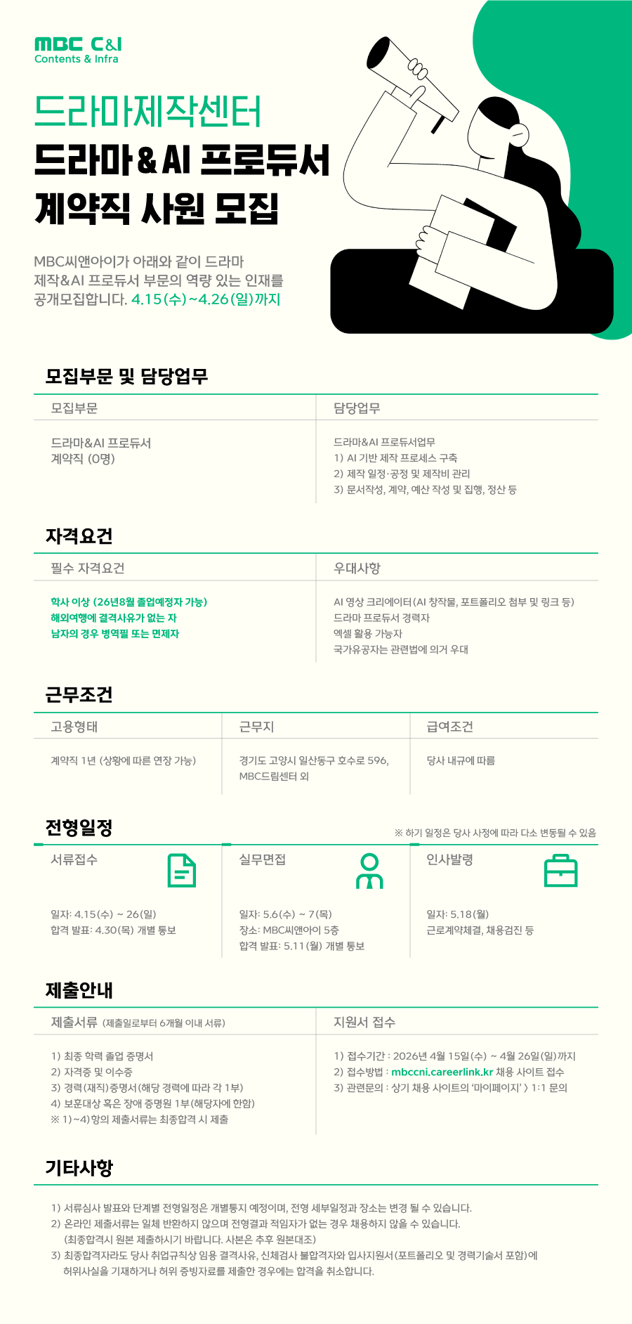 드라마제작센터 드라마 & AI 프로듀서 계약직 사원 모집